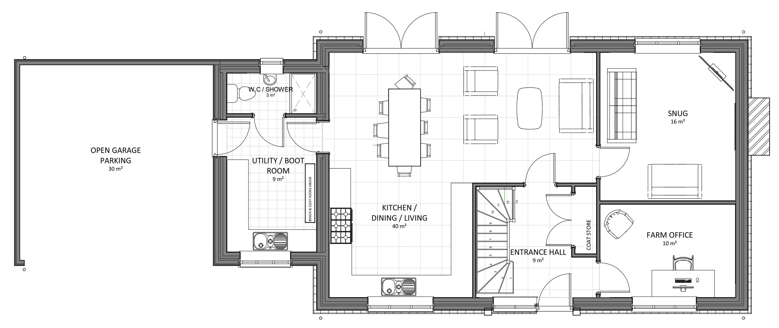 The proposed dwelling has been designed as a simple farmhouse form that reflects the traditional rural buildings found within the surrounding Herefordshire landscape. The design adopts a straightforward rectangular plan with a pitched roof and modest front porch, creating a house that feels appropriate to its agricultural setting. The internal layout separates the more private family spaces from the practical working areas of the house, including a farm office and boot / utility entrance, ensuring the dwelling responds to the operational needs of the farm. Living spaces are positioned to the rear of the house to take advantage of views across the surrounding countryside and to create a strong connection between the house and the garden. The overall scale, form and material palette aim to create a modest rural dwelling that integrates comfortably within the character of the farm and wider landscape.